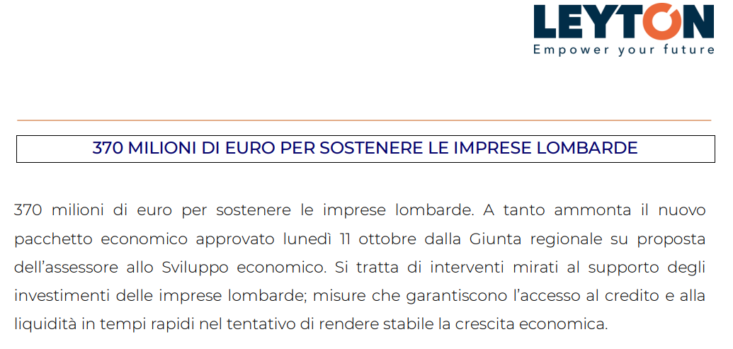 370 milioni di euro per sostenere le imprese lombarde
