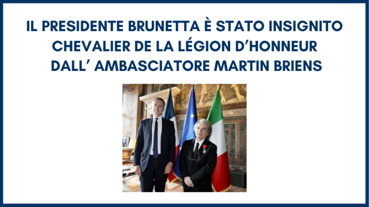 Martin Briens, Ambasciatore di Francia in Italia, ha insignito Renato Brunetta, Presidente del Consiglio nazionale dell’economia e del lavoro (Cnel), già Ministro per la Pubblica amministrazione e l’Innovazione, del titolo di Chevalier De La Légion D’honneur (Cavaliere della Legione d’onore) a nome del Presidente della Repubblica