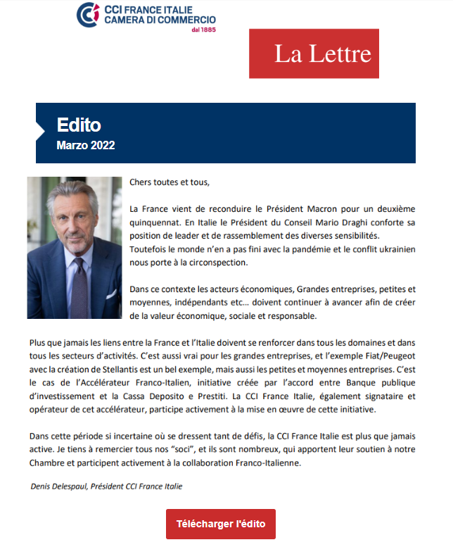 Publications Newsletter Marzo 2022 26 aprile 2022 La Newsletter della CCI France ItalieScaricala ora ! MARZO 2022