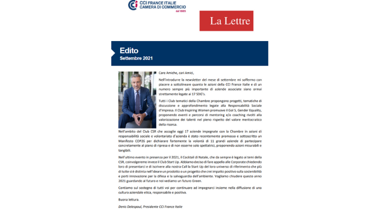 Publications Newsletter Settembre 2021 8 ottobre 2021 La Newsletter della CCI France ItalieScaricala ora ! SETTEMBRE 2021
