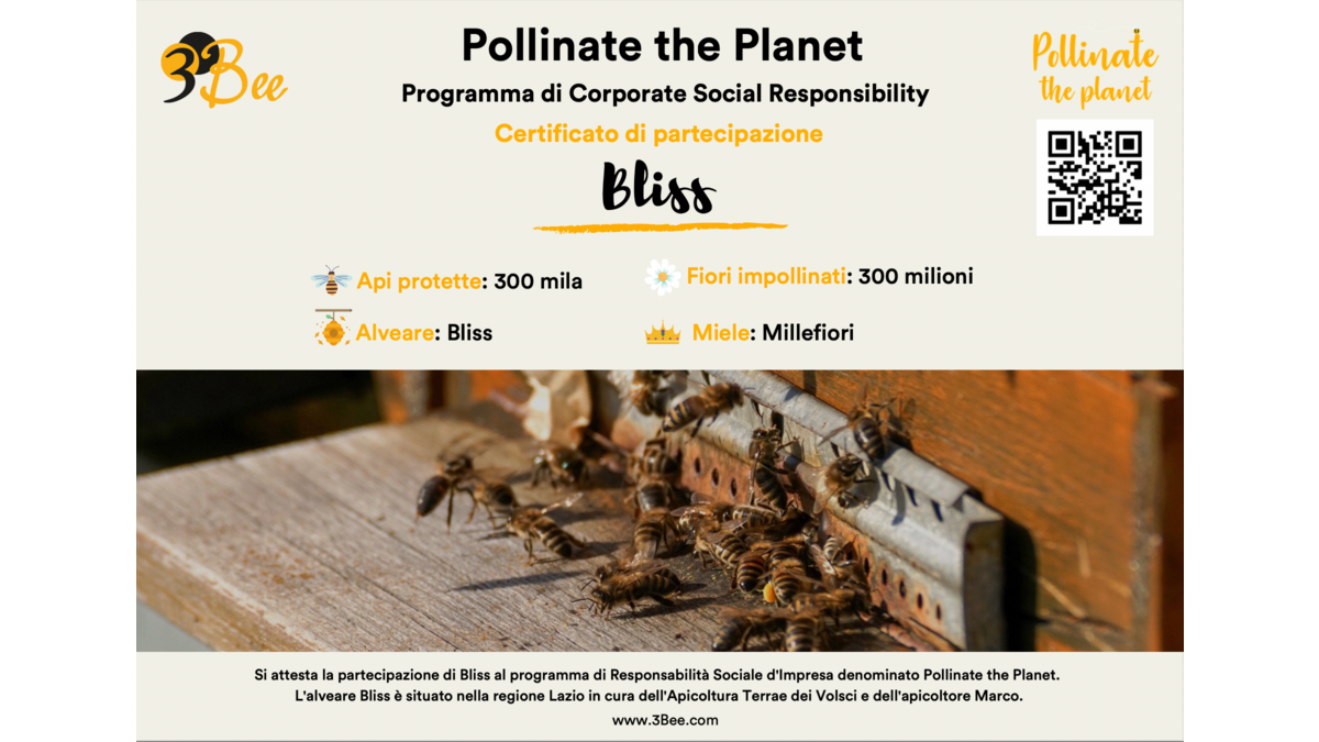 La collaborazione che unisce Bliss Corporation a 3BEE fa parte di una più ampia visione strategica, che consente a tutti coloro che usufruiscono dei servizi delle reciproche imprese di compiere un atto d’amore verso l’ambiente: un esempio di come insieme si possa credere nella realizzazione di un futuro migliore e sostenibile.
