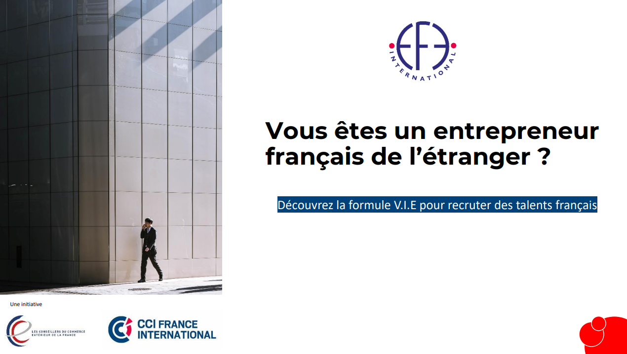 EFE International permettra en particulier aux E.F.E (Entreprises ou Entrepreneurs français(es) de l’Etranger) d’accéder au dispositif des Volontaires Internationaux en Entreprises (V.I.E).