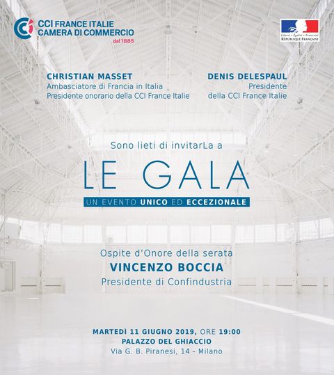 Insieme a S.E. Christian Masset, Ambasciatore di Francia in Italia, Le Gala, evento di maggior prestigio della CCI France Italie, si svolgerà l'11 Giugno a partire dalle 19.00 al Palazzo del Ghiaccio, location storica della città di Milano e riunirà come ogni anno illustri rappresentanti del mondo imprenditoriale e personalità di spicco della rete diplomatica e istituzionale franco-italiana.