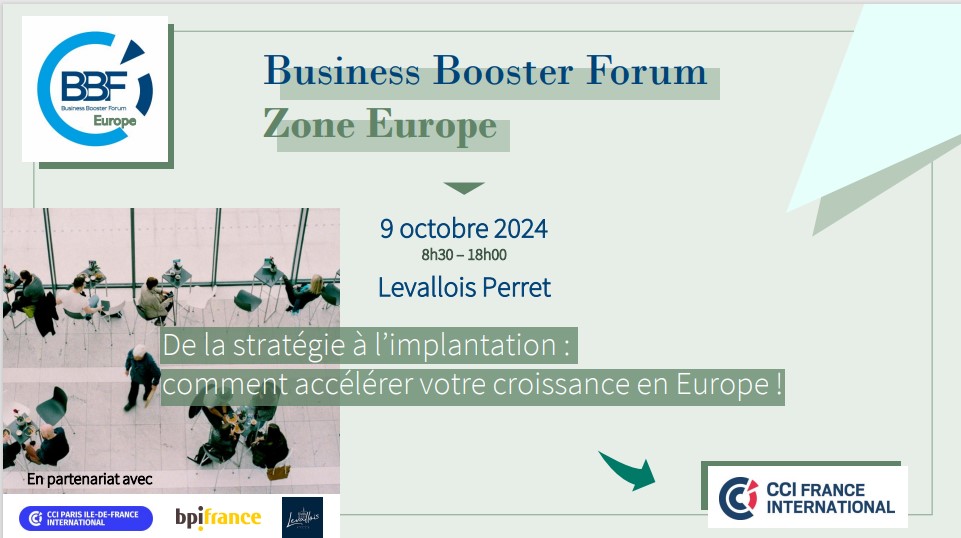 Partecipate al Business Booster Forum della zona Europa il 9 ottobre 2024 a Levallois-Perret, una giornata dedicata alla crescita e allo sviluppo delle PMI francesi in Europa.