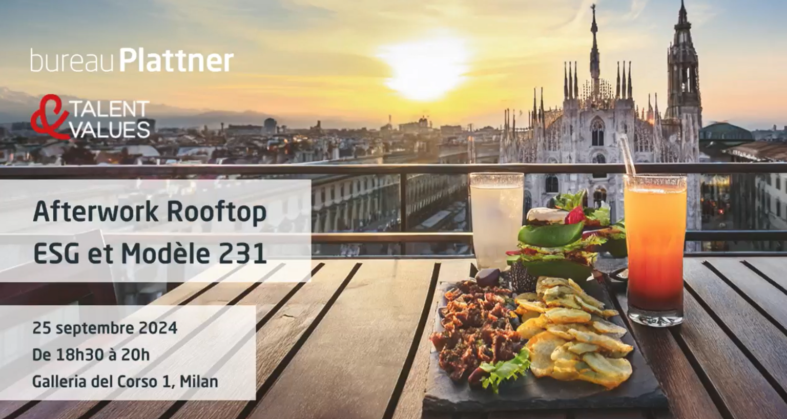 Bureau Plattner è lieto di invitarvi all'Afterwork dal titolo "ESG e modello 231", organizzato in collaborazione con Talent & Values. Questo evento offrirà l'opportunità di discutere le questioni chiave relative ai criteri ESG e al Modello 231, in un contesto conviviale sulla terrazza dei loro uffici di Milano.