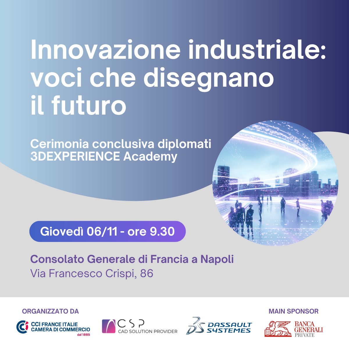 In presenza della Console Generale di Francia a Napoli, Lisa Moutoumalaya e dell'OnorevoleLucia Albano, Sottosegretario al MEF, durante la mattinata, si alterneranno voci e prospettive che stanno ridisegnando il panorama dell’industria, con uno sguardo concreto sul ruolo della formazione e del talento nel plasmare nuove competenze.