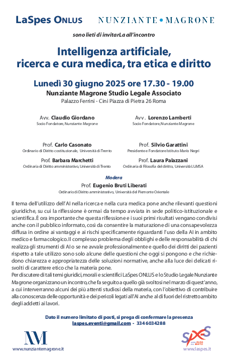 Per discutere di tali temi giuridici, morali e scientifici LaSpes ONLUS e lo Studio Legale Nunziante Magrone organizzano un incontro, che fa seguito a quello già svoltosi nel marzo di quest’anno, a cui interverranno alcuni dei più attenti studiosi della materia, con l’obiettivo di contribuire alla conoscenza delle opportunità e dei pericoli legati all’AI anche al di fuori del ristretto ambito degli addetti ai lavori.