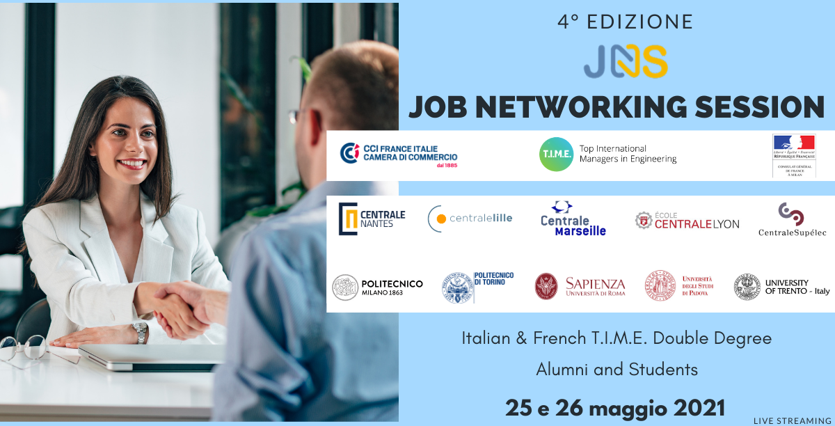 Forte del successo delle precedenti edizioni, il 25 e 26 Maggio 2021 si svolgerà la 4° edizione della JOB NETWORKING SESSION (JNS), organizzata dal Gruppo delle Écoles Centrale francesi insieme ai loro partner universitari italiani della rete T.I.M.E. (Top International Managers in Engineering).