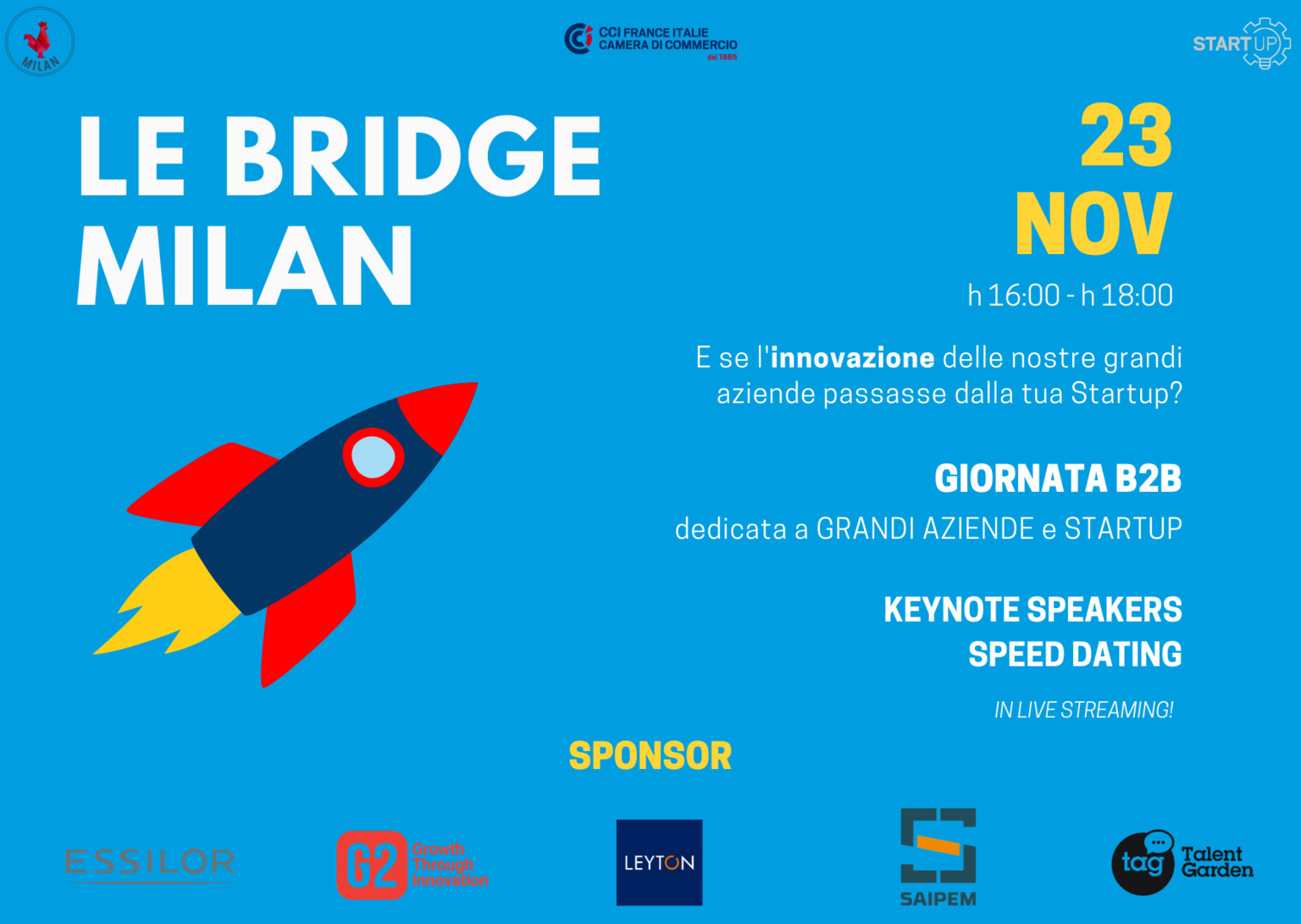 Dopo il successo della PRIMA EDIZIONE, torna la giornata B2B della CCI France Italie dedicata a grandi aziende (Responsabili Innovazione, ma anche Responsabili Marketing, Finanza, Acquisti, etc…) e startup italiane e francesi, basata su incontri speed dating