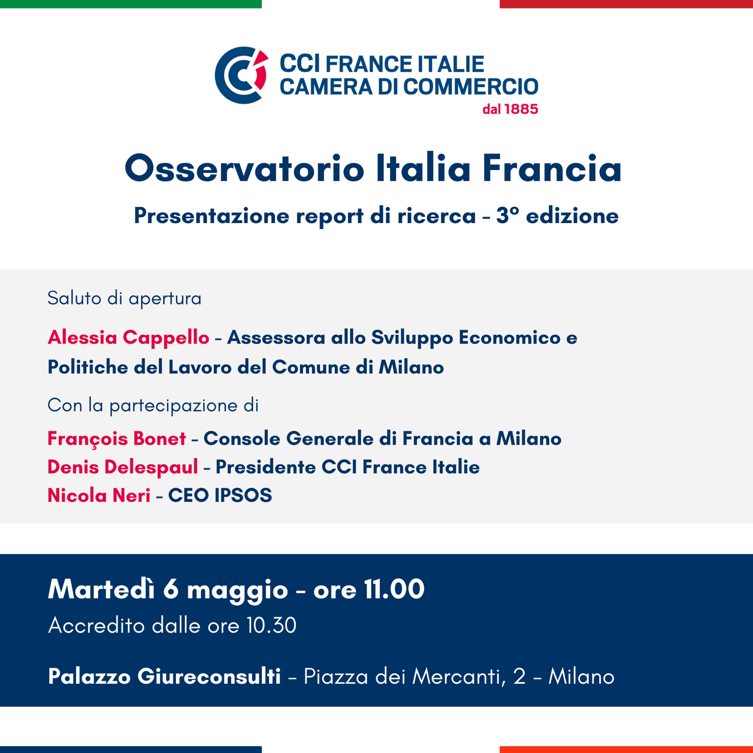 Anche quest’anno la Chambre ha promosso un’indagine condotta da IPSOS nell’ambito dell’Osservatorio Italia-Francia, con l’obiettivo di analizzare i principali driver e le barriere che influenzano la cooperazione tra i due Paesi. I risultati dello studio verranno presentati il: