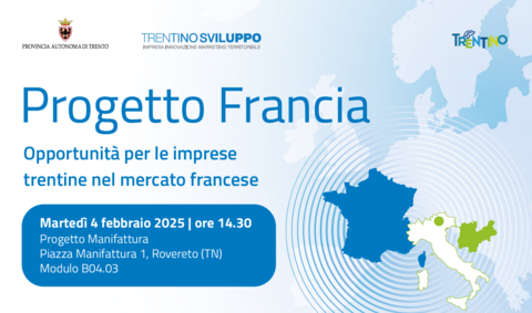 La CCI France Italie vi invita a partecipare all'evento organizzato con la collaborazione di Trentino Sviluppo e la partecipazione di ASAT - Associazione Albergatori ed Imprese Turistiche della Provincia di Trento, ANCE Trento, Associazione Artigiani Trentino, Confcommercio Trentino, Confesercenti del Trentino, Confindustria Trento, Cooperazione Trentina, Trentino Marketing e Camera di Commercio, Industria, Artigianato, Turismo e Agricoltura di Trento.