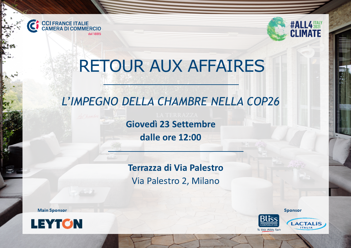 ll Retour Aux Affaires è stato incluso quest'anno nel Programma "All4Climate - Italy 2021", volto a promuovere il 2021 come l'anno dell'Ambizione Climatica, dedicato al tema della COP26. L'evento sarà l'occasione per presentare il Manifesto COP26 e sottolineare l'impegno della Chambre e quello delle aziende della comunità d'affari franco-italiana sul tema dei cambiamenti climatici e della responsabilità sociale d'impresa.