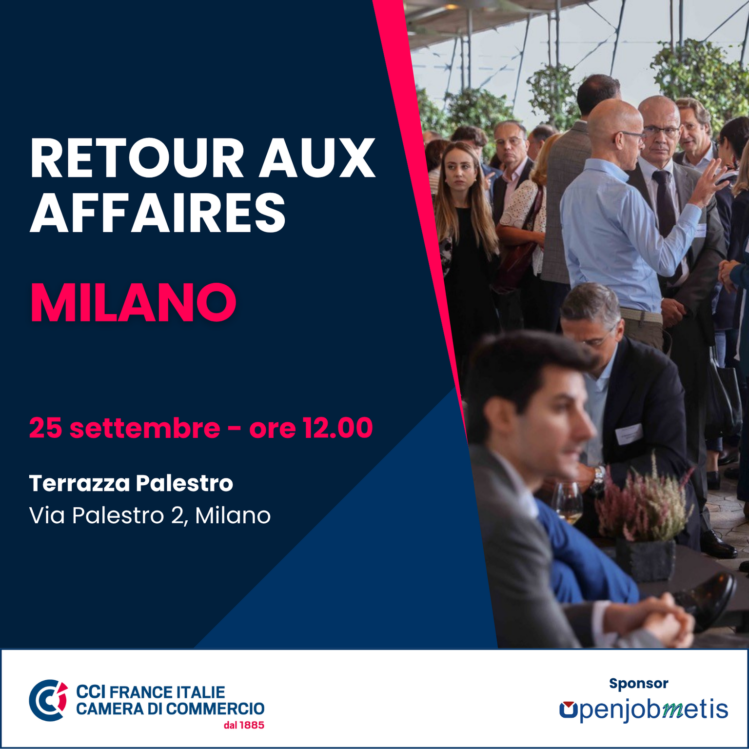 Il Business Lunch della comunità d’affari franco-italiana si terrà, come di consueto, presso la Terrazza di Via Palestro, giovedì 25 Settembre dalle 12:00 alle 14:30.