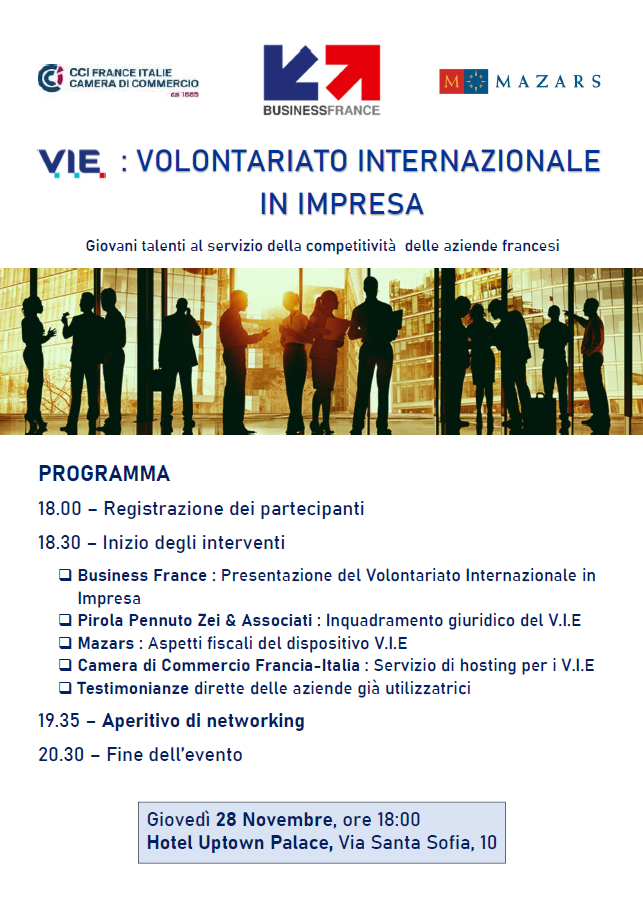 Il V.I.E (Volontariato Internazionale in Impresa) è la soluzione economica, semplice e flessibile che permette alle aziende francesi di affidare a un giovane di età compresa tra i 18 e i 28 anni, una missione professionale di durata variabile (6-24 mesi) all'estero (per esempio in Italia).