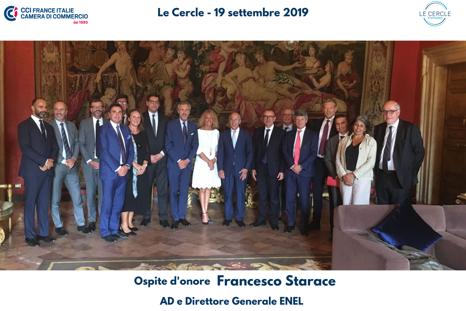 Orateur et invité d’honneur de la réunion a été Francesco Starace, Administrateur délégué et Directeur Général d'ENEL, qui, en présence de Présidents et Administrateurs Délégués de grands groupes de la communauté d’affaires franco-italienne, a fait une intervention sur le thème de "Innovation, responsabilité sociale d’entreprise et développement durable: la vision d’Enel sur le futur du secteur énergétique national et international".