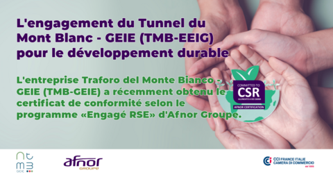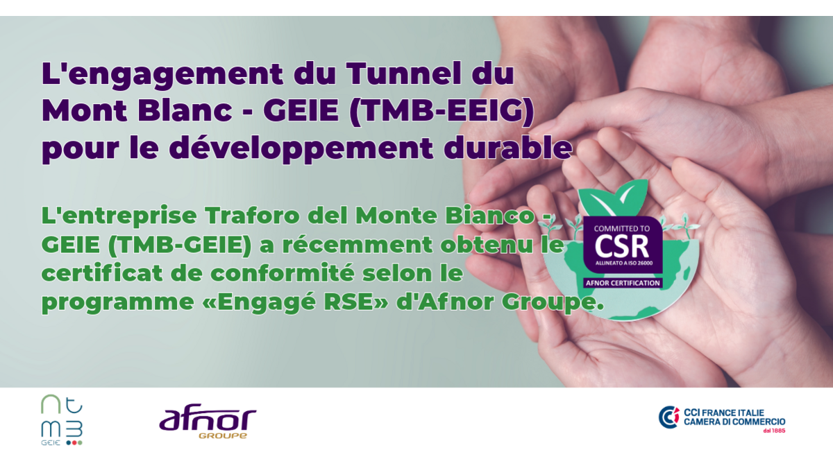 L'entreprise Traforo del Monte Bianco - GEIE (TMB-GEIE) a récemment obtenu le certificat de conformité selon le programme «Engagé RSE» d'Afnor Groupe.