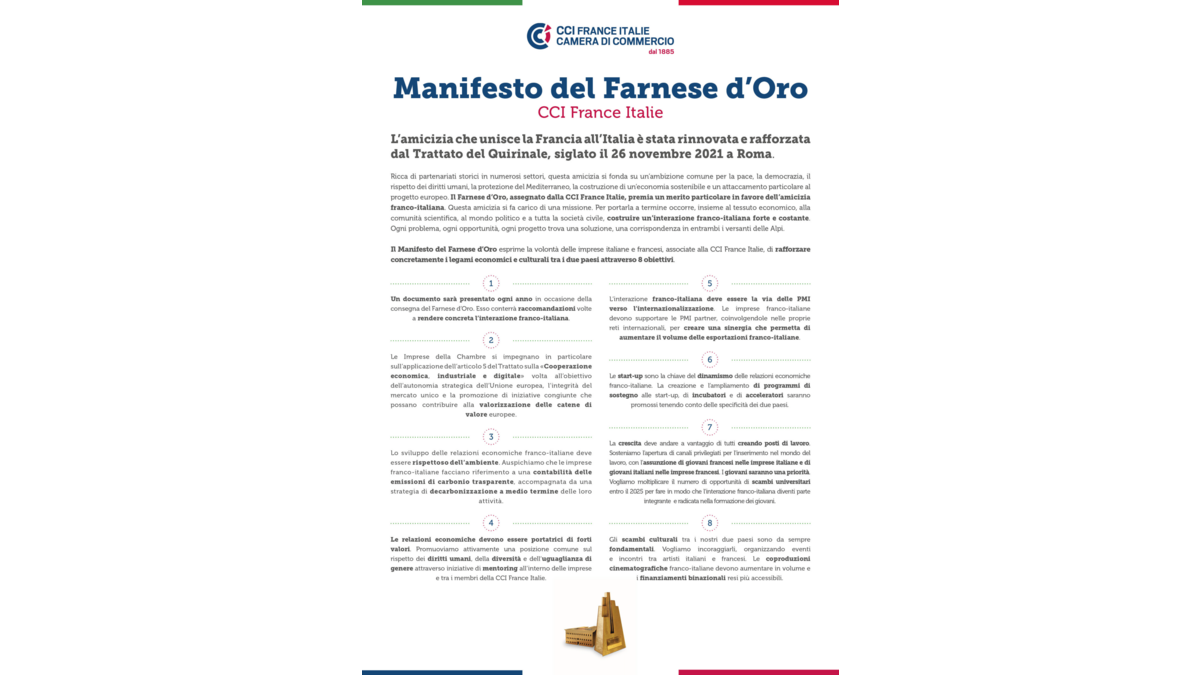 Avec Le Farnèse d’Or, nous voulons célébrer l’amitié qui lie depuis toujours l’Italie et la France, en soulignant l’importance d’un dialogue continu et de valeur. Un engagement scandé dans le Manifeste, selon huit points programmatiques.