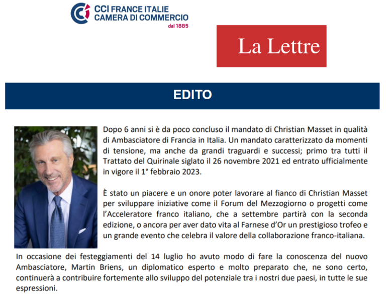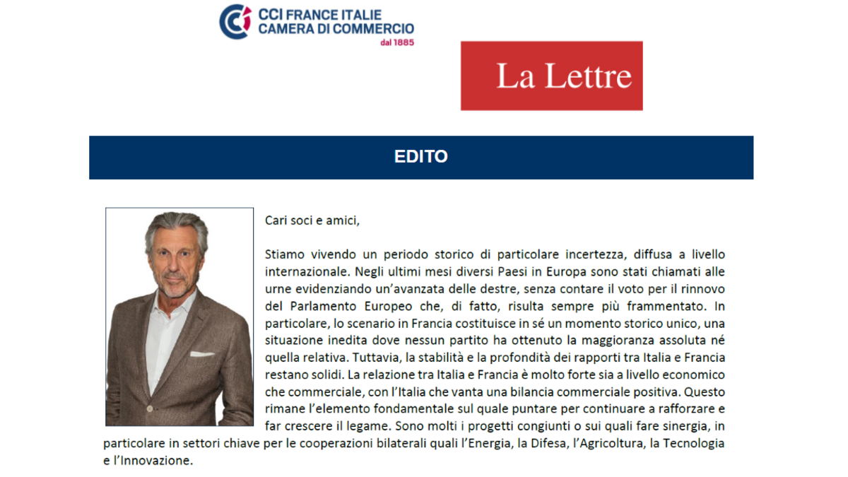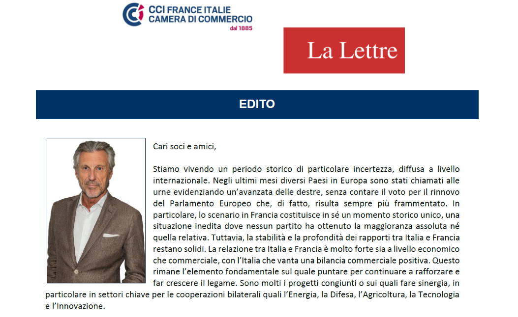 Publications Newsletter Juillet 2024 Le 22/07/2024 La Newsletter de la CCI France ItalieTéléchargez-le maintenant !jUillet 2024