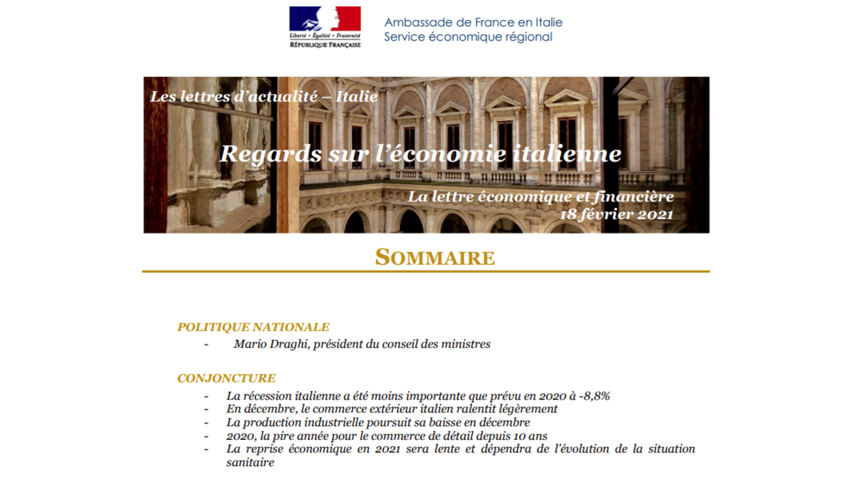Vous trouverez le nouveau numéro de Regards sur l’économie italienne – la lettre économique et financièrerédigé par le Service économique régional d'Europe du Sud-Est.