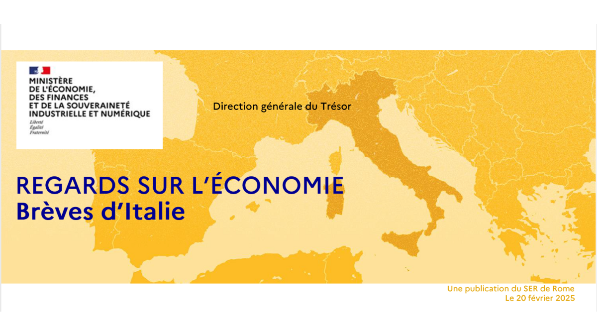 Regards sur l'économie Le 24/02/2025 Brèves d'ItalieLa Direction générale du Trésor a publié le dossier contenant les principales informations économiques sur l'Italie.CONSULTEZ LE REPORT DECOUVREZ NOS SERVICES