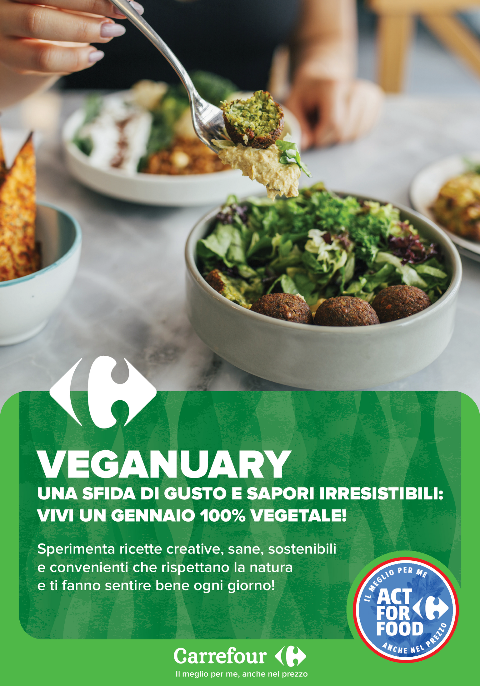 Milan, janvier 2025 - Pour la première fois, Carrefour Italia, depuis 2023 première société Benefit de la GDO au niveau national, adhère à Veganuary : Une initiative promue en Italie par l’association Essere Animali qui encourage les gens à essayer un régime 100% végétal tout au long du mois de janvier, dans le but de sensibiliser aux choix alimentaires végétaliens et de promouvoir un mode de vie plus durable.