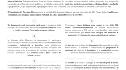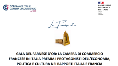 saranno conferiti 5 prestigiosi riconoscimenti Farnese d’Or, distribuiti nelle seguenti categorie: politica [...] France Italie – Camera di Commercio hanno ideato il Farnese d’Or, un evento esclusivo , dal forte carattere [...] politica, economica, scientifica o culturale. Il Farnese d’Or è quindi un momento celebrativo , in cui vengono